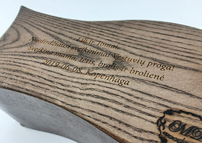 Galime graviruoti dažytą, lakuotą ar beicuotą medieną. Graviruojant tokią medieną lazerio paveiktoje vietoje išgaunama natūrali medienos spalva.