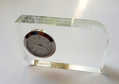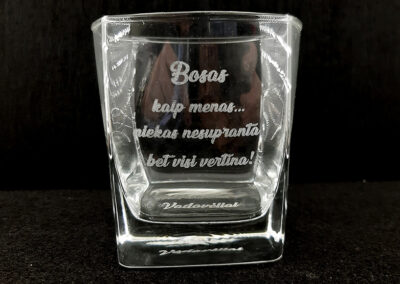 Stiklo graviravimas lazeriu galimas ant visų gaminių, tačiau labai plono stiklo graviruoti nepatartina, nes jis paveiktas lazerio spindulio karščio gali skilti. Stiklo graviravimo metu jo paviršiuje atsiranda mikro sprogimai todėl paveiktose vietose stiklas tampa matinis (dažniausiai balkšvos spalvos). Graviruotą stiklą nesunkiai galime įtrinti akriliniais dažais. Tokiu būdu galima išgauti labai kontrastingą vaizdą. Tiek ant veidrodžio, tiek ant stiklo galime graviruoti ir labai smulkius ornamentus, ir nuotraukas.