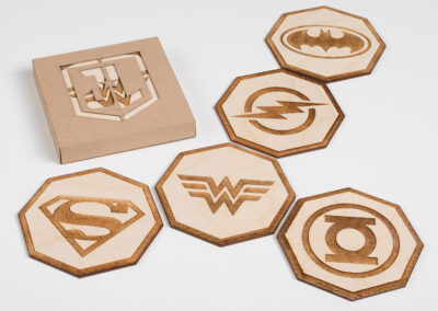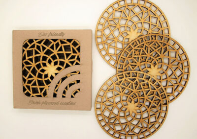 Lazeriu pjaustome įvairius padėkliukus. Dažniausiai juos gaminame iš medžio, tačiau galime padaryti ir iš kitų medžiagų: odos, veltinio, stiklo ir kt. Turime nemažą pasiūlą savo gaminamų padėkliukų. Taip pat galime daryti ne vien pjautus, bet ir pjautus – graviruotus padėkliukus.