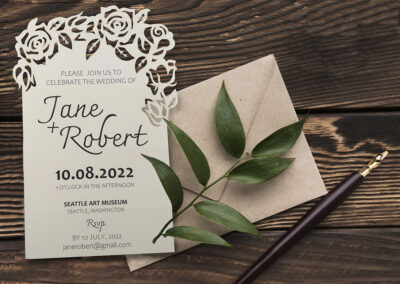 Dažniausiai kvietimus gaminame iš medienos arba dekoratyvinio popieriaus. Lazeriu pjaunant popierių galima išgauti net pačius smulkiausius ornamentus, nes pjūvio storis itin plonas. Mūsų technologinės galimybės leidžia išpjauti net baltą popierių be pašalinių padegimų.